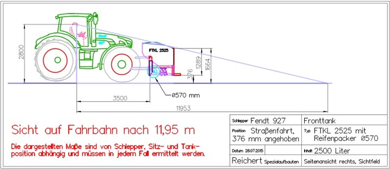 Abhängig vom Kundenschlepper und der Fahrerposition variiert die Sicht auf die Straße. Deshalb ist ist diese in jedem Einzelfall zu überprüfen. Wenn Sie uns Maße mitteilen, können wir Ihnen eine Zeichnung erstellen. Gerne prüfen wir für Sie die Fronttankposition an Ihrem Schlepper und die Sicht auf die Straße.