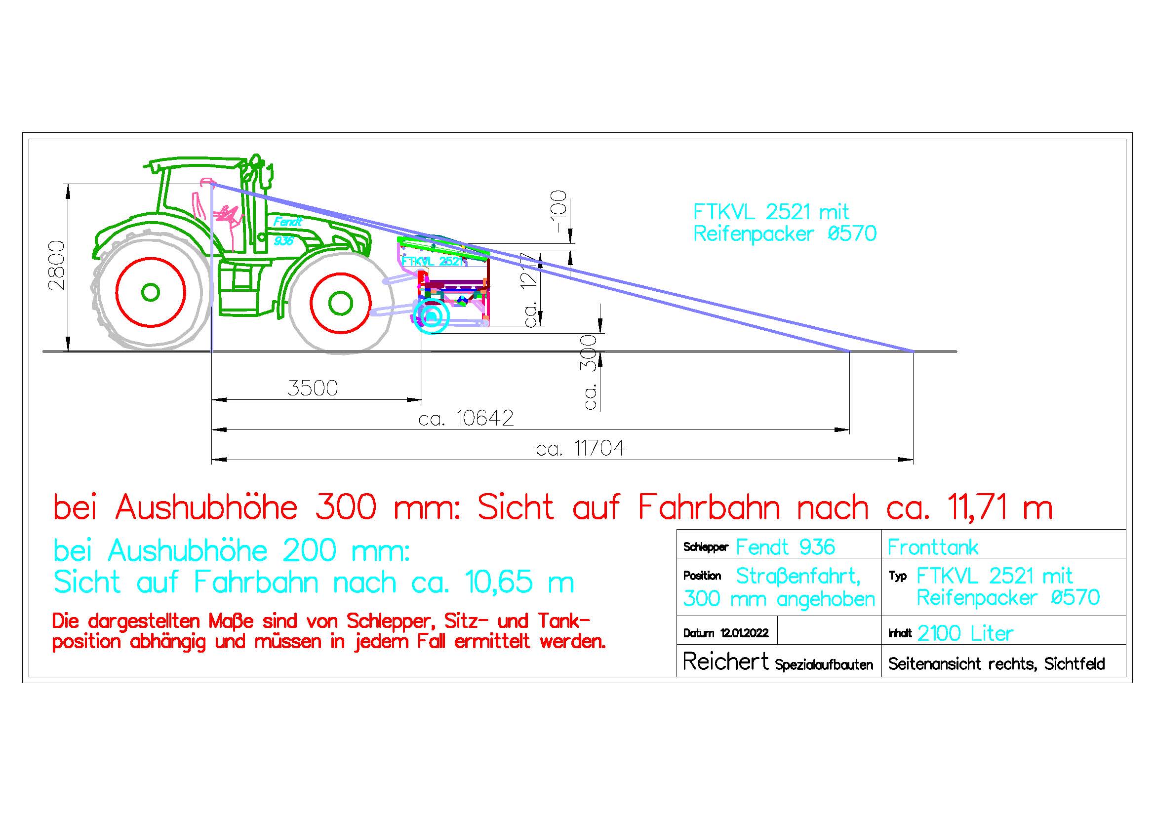 Abhängig vom Kundenschlepper und der Fahrerposition variiert die Sicht auf die Straße. Deshalb ist ist diese in jedem Einzelfall zu überprüfen. Wenn Sie uns Maße mitteilen, können wir Ihnen eine Zeichnung erstellen. Gerne prüfen wir für Sie die Fronttankposition an Ihrem Schlepper und die Sicht auf die Straße.