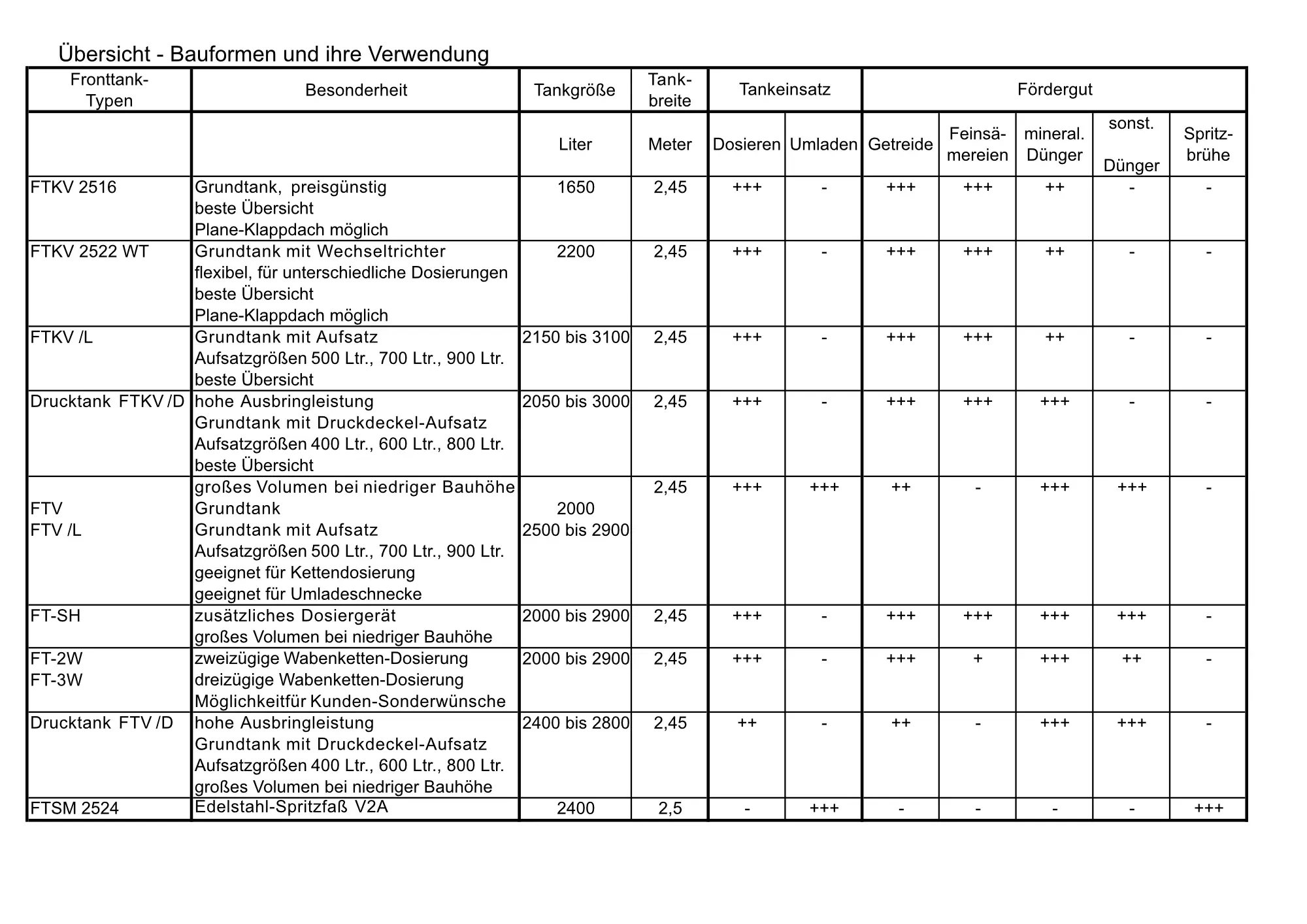 | Fronttanktypen | Besonderheit | Größe (in l) |